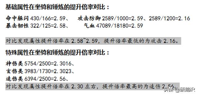通过上述计算我们可以看出来,除了追伤外,其他同类属性之间的差异并不大,除了攻击属性在个别坐骑外会有1200的数值,其余属性在最大值设定方面没有区别,所以洗炼属性中只有攻击属性是收益略微高的,追伤属性收益是较低的。在我们调节攻击属性时尽量在坐骑中进行,调节追伤属性时尽量在锤炼中进行。