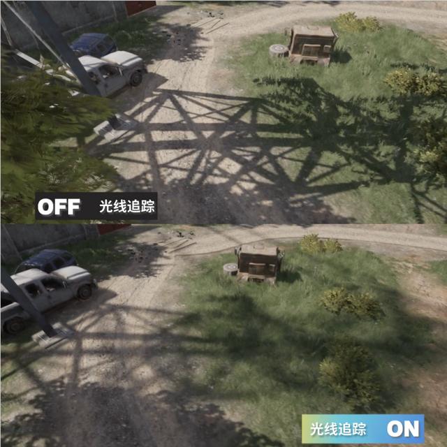 在《暗区突围》这一草坪场景中看到,没开启光追软阴影效果时,阴影是非常生硬呈现出来的,无法呈现出真实世界中,光线照射远近物体中的距离感,以及光线强弱对于阴影明亮度形成的真实关系,而在开启光追软阴影后,可以看到不同物体都能根据距离远近,来表现出最真实的模糊边缘,这样就有了层次感。