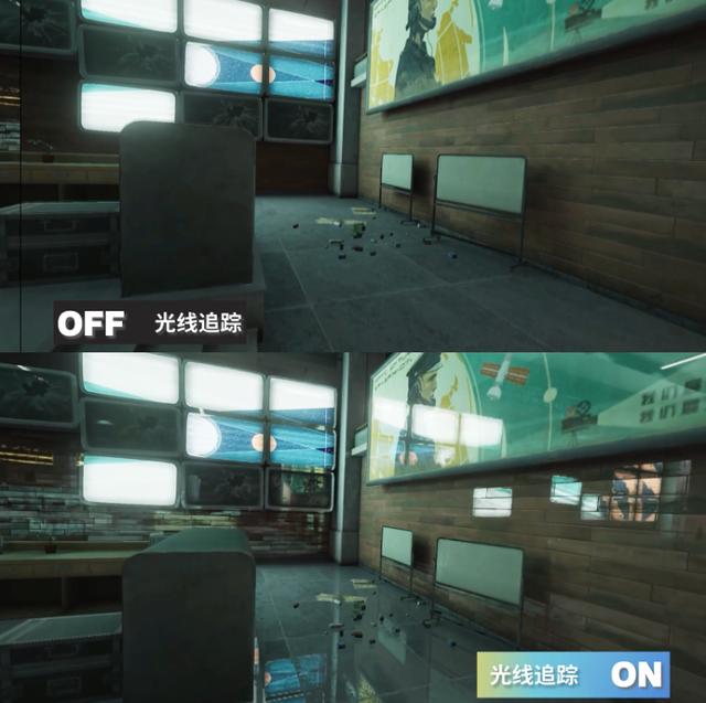 因此在光追三要素中光线追踪镜面反射技术,就是利用光线照射到物体中后形成的真实反射,来规避“贴图”带来的不真实感,还是以《暗区突围》为例,不难看出在关闭这项技术时,不管操控人物如何移动,“前方”的场景中光线都是一样的,而在开启光线追踪镜面反射后,地板上自然的反射效果,让画面显得更加立体,空间感更强。