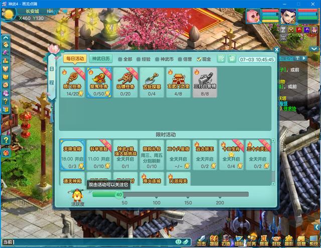 我们看到第一行,每日活动-神武日历—全部-经验-神武币-信誉-现金