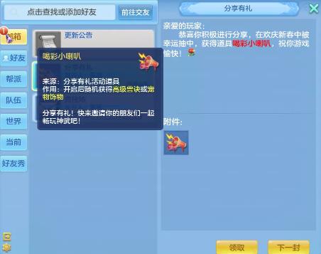 活动期间为2021年1月29日至2021年2月18日每天19:58在全服开放,在活动中,系统将从当天分享过游戏的在线小伙伴们中随机抽取幸运伙伴,被抽中的幸运伙伴可获得道具喝彩小喇叭,小伙伴们开启道具可随机获得高级兽诀或宠物饰物,或许一发必中的就是你。