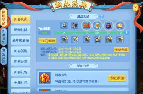 新春庆典将于2021年1月29日8:00至2021年2月19日8:00全服开放,玩家等级大于30级即可参加。在新春庆典内,玩家登陆游戏、完成日常和新春活动均可获得新春庆典进度,当进度达到相应阶段即可领取丰厚奖励,玩家还可以花费金币解锁新春秘宝拿额外奖励。