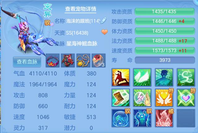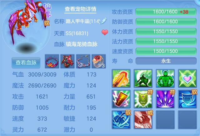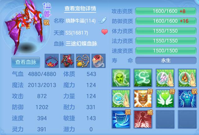首先我们看到的是在比赛中担任首发宠的仙兽翼龙,可以看出打造思路是一个偏暴力的耐剑气。攻击资质和防御资质都是1600,体资法资1550,速度资质1500。打书搭配是高级必杀+高级夜战+高级强壮+高级保命+高级审判,以及护符技能高级防御+剑气四射。