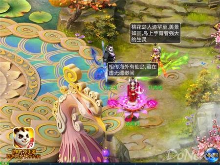 相传海外有桃花岛,岛在虚无缥缈间。人迹罕至的桃花岛上遍地桃花盛开,香飘十里,如今桃花岛揭开神秘的面纱出现在世人面前,日色下小桥流水,落英缤纷。这样美丽的桃源仙境,可以在傲来国(168,7)艄公处前往探索。
