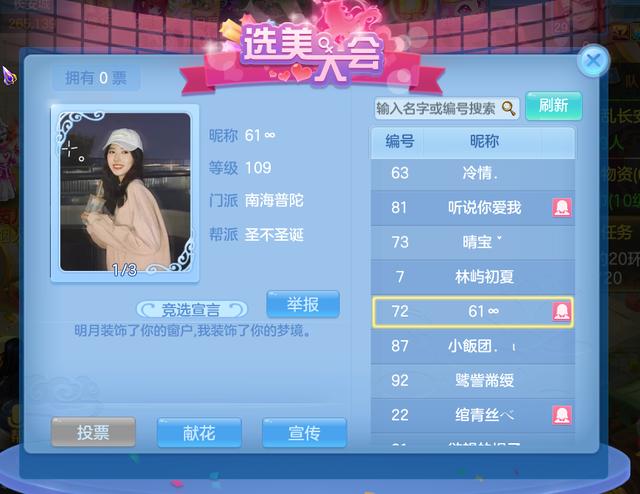 在报名成功后,我们可以在聊天频道分享自己的宣传单进行拉票,如果你有一张美美的真人照片,很容易吸引到众多玩家为你投票。当然,除了自己拉票外,还可以动员帮派、亲友帮助自己,多发世界频道,吸引其他玩家来看自己的宣传单,一传十,十传百。在拉票期间,或许你也能够结识到不少新朋友。