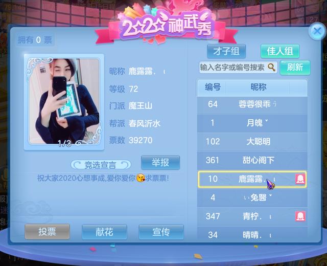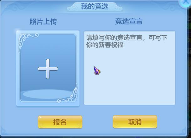 报名时玩家们只要上传自己的照片,写下自己的参赛宣言就可以报名了,有头像秀和真实照片的玩家会加不少分,没有报名的玩家们也可以对自己心仪的选手进行投票,参赛选手还可以通过拉票功能在世界频道散发自己的宣传单为自己拉票,为选手献花还可以获得更多的票数。
