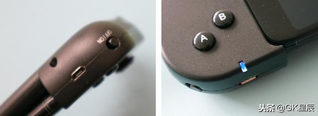 开关键以及连接指示灯都在手柄的下方,蓝牙连接成功后蓝色指示灯常亮。
