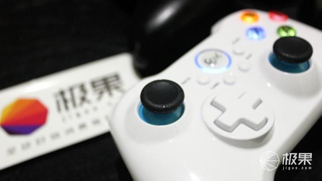 两个摇杆使用了黑色硅胶材质,与上代不同的是两个摇杆使用了一样的设计并没有区别,但摇杆下半部分使用了更为活泼的蓝色,与整体的白色搭配起来显得更加的灵动。