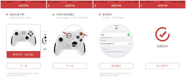 通过扫描包装盒、说明书上的二维码即可下载专属APP,通过蓝牙将手机与北通阿修罗2手柄连接起来就可以使用了。连接的过程非常简单,仅需四步即可完成连接,首次安装在未连接手柄的状态下是没有办法进入游戏大厅的。