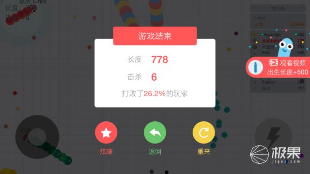 测试的第二款也是比较流行的一款小游戏——贪吃蛇大作战,办公室几乎人手一个,每天没事了就相互之间晒下战绩,真是消磨碎片时间的好东西。