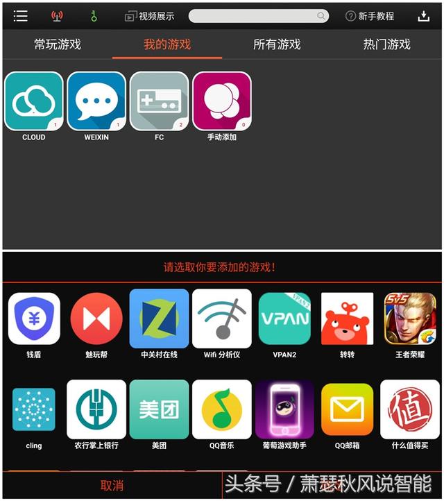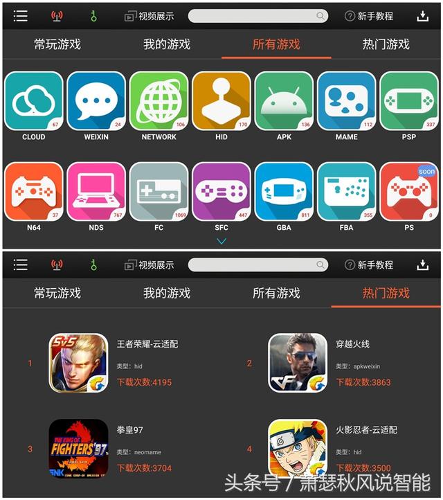 下载安装HandJoy游戏大厅,现在的手游游戏厅内容大同小异,各种设备平台的游戏都可以在游戏厅里找到,比如HID、MAME、PSP、N64、NDS、FC等,让80后的你会自觉回想之前的美好时光。软件也提供了热门游戏,让用户快速选择下载、把玩,对于手机本已安装游戏的用户,软件也支持手动添加,比如萧风已经安装了《王者荣耀》、《穿越火线》等,添加完后在“我的游戏”里进入。
