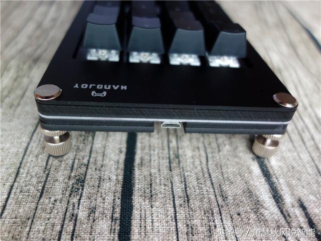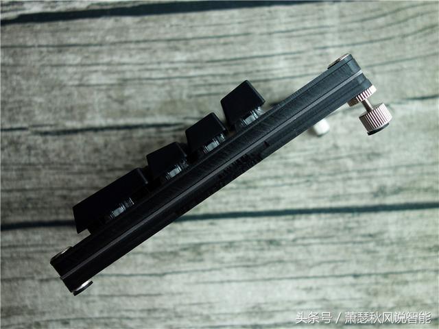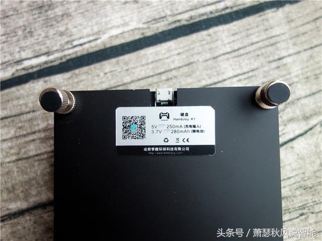 从键盘的侧面看,就像几块PCB板组合而成,板的切割工艺很一般,有点不平整,影响视觉效果,建议厂家改进。顶部的两个金属螺丝是可以调整高度的,配合底部两个固定金属螺丝起到调整键盘斜度之用,满足不同用户的手腕使用。背面顶部有个Micro USB接口,是作为充电和鼠标连接之用,下方贴有产品的参数标签,可以知道键盘内置280mAh电池。