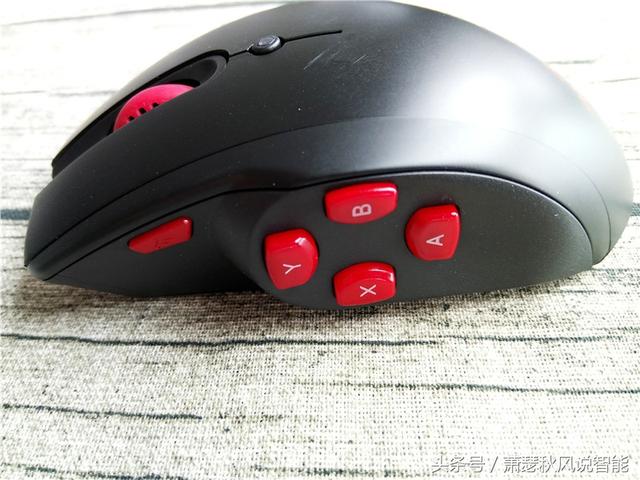 鼠标的功能按键都布置在左侧,最左边的是F键,右边是A、B、X、Y4个按键对称分布,使用时大拇指刚好覆盖在四个按键上。