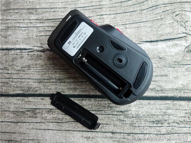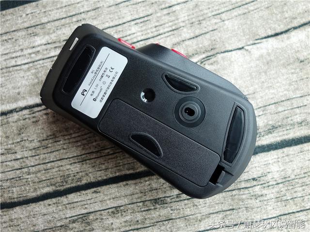 鼠标底部是电池仓、激光定位光学引擎,四边设有防滑脚垫。鼠标采用蓝牙连接模式,AA碱性电池供电,顶部侧面的Micro USB接口主要是和键盘连接作为手游组合使用,也可以连接电脑当做有线鼠标使用。