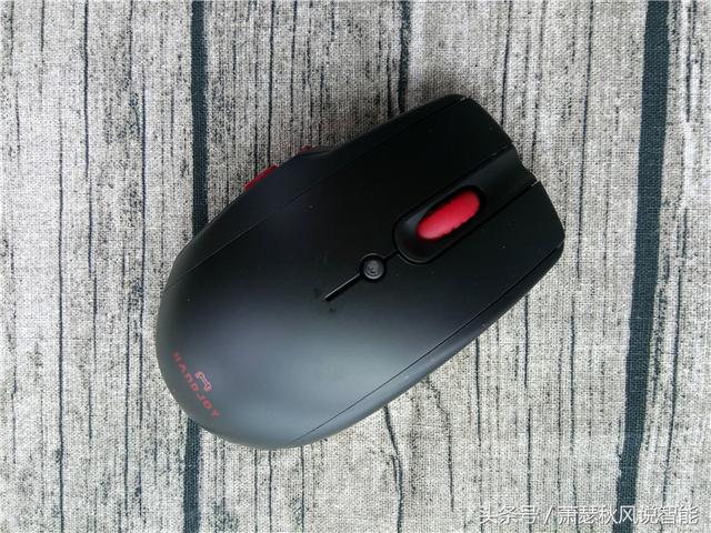 杀戮之王鼠标采用黑色外观设计,从顶面看和普通的无线鼠标一样,左、右按键、滚轮,中间的按键是开关功能兼工作指示灯,而非常见DPI切换功能。红色logo印刷在鼠标后部,可惜没有设计灯光效果。