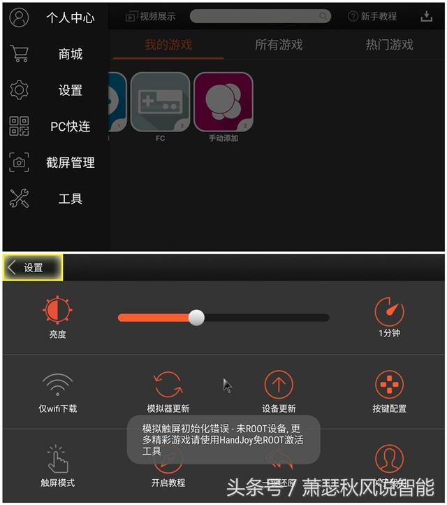 游戏厅软件提供了视频展示、新手教程等,方便用户快速熟悉。点左上角的按钮可以唤出设系统菜单,包括个人中心、商城、设置、PC快连、截屏管理、工具等。其中常用到的是设置菜单里的功能,包括模拟器更新、设备更新、按键配置、触摸模式、开启教程、一键还原等,需要注意的是没有ROOT的手机就无法开启触屏模式。