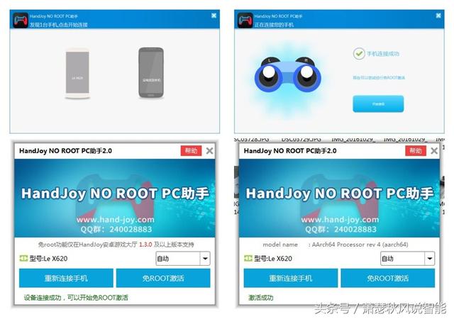由于现在各大手机厂家都有自家二次开发的安卓系统,ROOT比较麻烦,而且ROOT成功后又会影响售后服务,所以厂家很贴心的提供了免ROOT工具软件解决了大部分用户的后顾之忧。在官网下载、安装HandJoy No ROOT PC助手2.0,手机连接电脑后按提示操作激活即可,需要注意的是需先把电脑的杀毒软件、手机助手类软件退出,以免软件找不到手机。