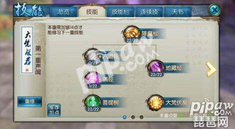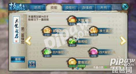 技能第三页:因果满,往生咒1点,明王经满,大慈悲满,明镜台满,大梵般若满。