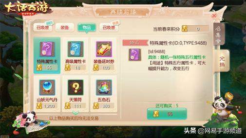 春来积分不仅可以用来兑换五色石、聚魄丹、龙之骨、玉符、高级属性卡等各种游戏道具,还能直接兑换萌宠小五叶和珍稀召唤兽山妖,还可以用于开启小五叶的技能格。使用抽奖券也有机会能够抽取到小五叶!万能的春来积分可以兑换海量好礼,赶紧行动起来,和自己的好友一起收集吧!
