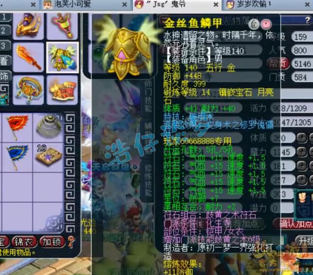 140级破甲术修罗傀儡妖套专用铠甲,体耐双加81,熔炼后初防达到了291,综合属性比160级的也差不了多少。