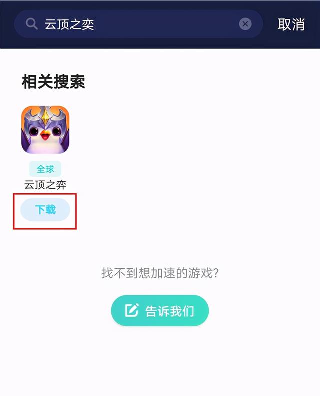 首先打开UU加速器App,点击右上角的搜索按钮,在搜索框内输入“云顶之弈”,然后点击结果中云顶之弈手游下方的“下载”,下载完成后点击安装就可以了。