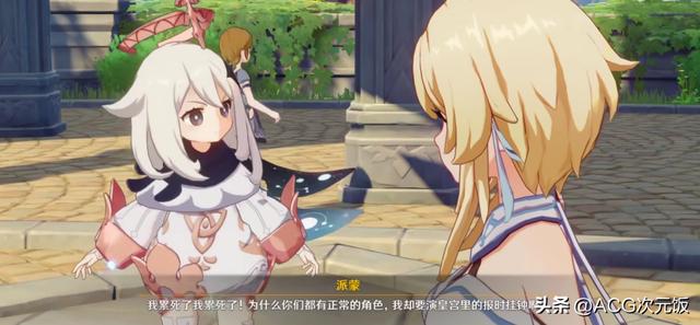 首先,2.8金苹果的剧情是从旅行者收到菲谢尔的邀约开始的。在赴约之时,旅行者看着菲谢尔和莫娜“演”了一出话剧,熟悉的中二气息和派蒙的插科打诨给金苹果群岛之旅打定了一个较为轻松诙谐的基调,此时的画面色彩也是明亮的、轻松的。