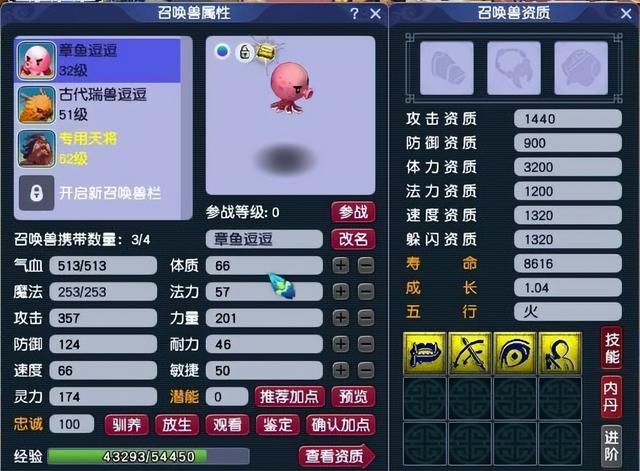 上面的这只召唤兽是章鱼,上面的这只章鱼还是大家在新手礼包中获得的,小编感觉上面的这只章鱼是大家在新手礼包中获得的最好用的新手召唤兽,因为这只章鱼的技能都很实用,这只章鱼拥有的技能是连击夜战偷袭吸血,虽然没有必杀,但是上面的这只召唤兽可以通过套装的方式来解决,而且上面的这只召唤兽还可以带善恶有报的套装。