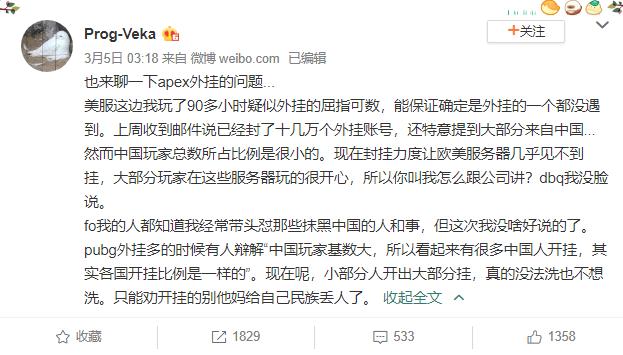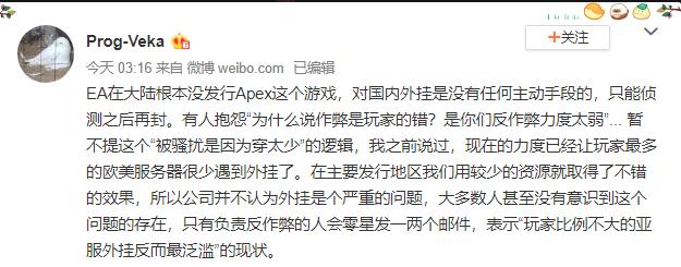 此前,《Apex英雄》开发商Respawn员工@Prog-Veka就表示游戏中大部分外挂来自中国,而且中国外挂产业已经超越了这边公司对外挂问题的理解。