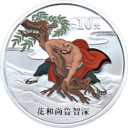 “花和尚鲁智深”银币,以夸张的造型,刻画了鲁达倒拔垂杨柳的艺术形象。币面上的鲁智深,僧鞋黑裤,光头赤膊,红色的袈裟系于腰间,双脚扎开马步,双手上下用力,浓眉倒竖,牙关紧咬,似有一声震天价“嘿”声,那粗大的垂杨柳树便拔地而起,缓缓倒下。仔细品读还会发现,林冲银币似是以实写虚,真实的画面蕴涵着深远的意境;鲁智深银币则是以虚写实,卡通变形的造型让鲁智深的神勇触手可及,一览无遗。两枚银币均为圆形精制币,直径40MM,重量1盎司,面额10元,成色99.9%,各发行60000枚,由深圳国宝造币公司承担铸造。