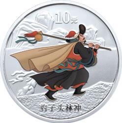 银币上,林冲红袄蓝衫,披风皂靴,脚下是起伏的山路,身旁是万丈深渊,远处是陡峭的山峰。林教头双手紧握红缨枪长柄,高视阔步,义无反顾,一付决绝而去的神态。凝重而沧桑的面容,浓烈而沉郁的衣着,配以目不斜视一往无前的造型,使得这位逃亡中的80万禁军教头,依然英气逼人,威风不减。