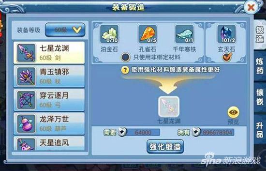 强化锻造:出好品质装备的小秘密就是使用强化材料进行强化锻造,需要消耗银两、装备的卷轴、对应的晶铁和锻造符,外加强化石。