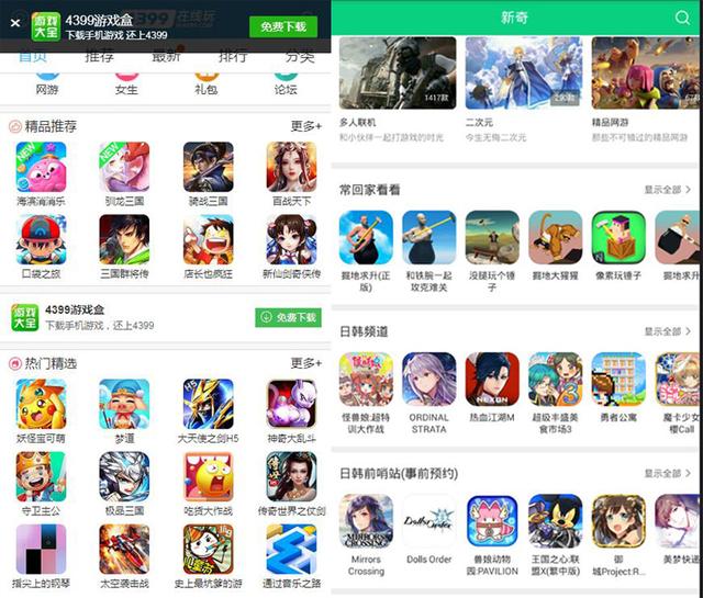 左:4399手机版网页,右:好游快爆【新奇】标签页