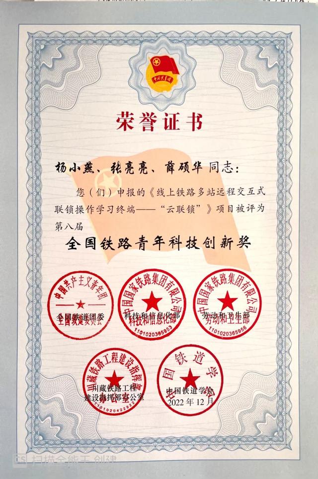如今,“云联锁”已经形成一套较完善和稳定的学习系统,而且在2022年铁道交通运营管理专业教学资源库验收现场演示中得到教育部评审专家的一致好评。近日,全国铁道团委发布第八届“全国铁路青年科技创新奖”,“云联锁”项目摘得该项荣誉。