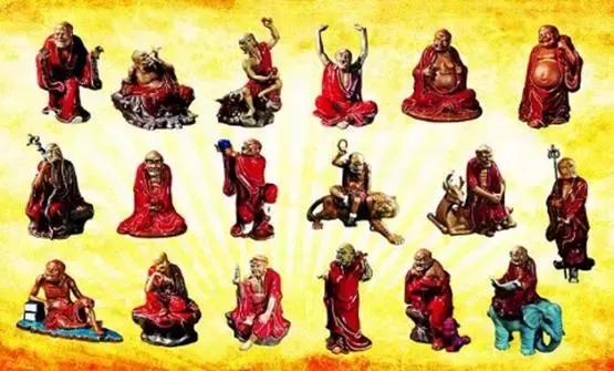 十八罗汉:坐鹿罗汉,欢喜罗汉,举钵罗汉,托塔罗汉,静坐罗汉,过江罗汉,骑象罗汉,笑狮罗汉,开心罗汉,探手罗汉,沉思罗汉,挖耳罗汉,布袋罗汉,芭蕉罗汉,长眉罗汉,看门罗汉,降龙罗汉,伏虎罗汉。(排名不分先后)