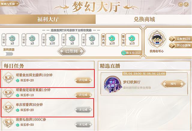 第一个任务就是每天的签到任务,签到一周能够获得,55点仙玉币,然后就是参加两个观看直播的任务,分别是观看盘丝洞主播十分钟跟单次观看满30分钟,这样只需要观看40分钟的直播就可以获得40点积分,加起来每周大约可以获得325点积分。