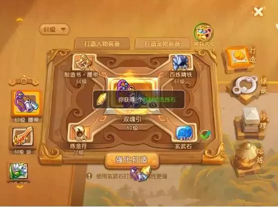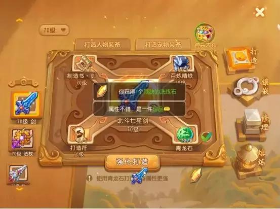 号主决定先打造武器,已经准备好了打造70级剑所需要的材料,直接开始强化打造。号主运气非常的好啊,珍品的数量特别多,尤其是这次打造,不仅武器是珍品,神兵大礼满了以后还给了一个残缺的洗炼石!