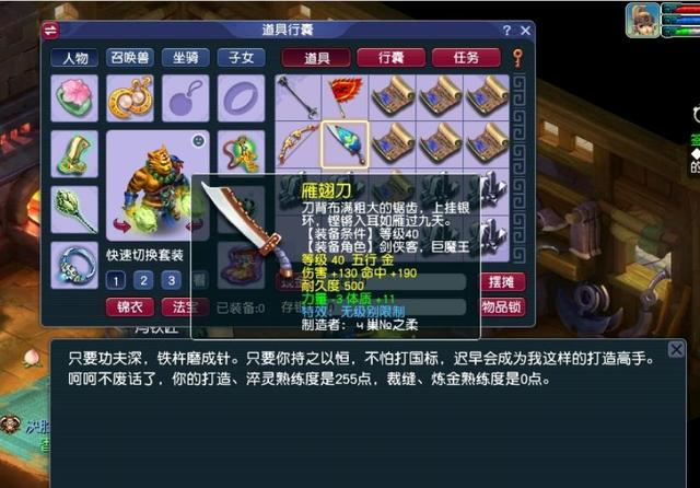 打30级、40级的武器肯定是为了提升熟练度,要达到500以上的数量,才能直接把铁丢进炉子里变成熟练度。估计玩家也是无聊新弄的号,然后想着以后满体就去卖打造、卖修理,可比去书店赚得多。不过运气还挺好,这才200多的熟练就出无级别了,而且刚好是把40级的达到,伤害130、命中190、减3力量、加11体质。武器的价值还是不低的,毕竟区内39天猴组的老板很多!