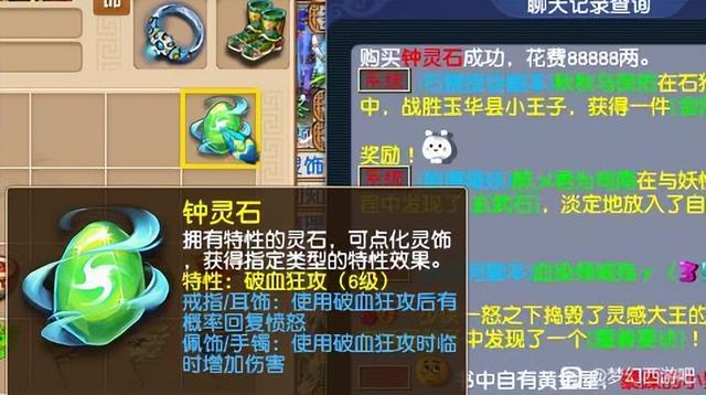 逛街看到一个6级的钟灵石,使用破血后有概率恢复愤怒,并且还能增加破血的伤害,凑一套任务是不是很强?8W8想都没想就秒了,而且还在想高兴肯定是捡漏了。钟灵石合成提升等级特别难,可是这种的特效真的没人用。用破血的情况肯定是任务难度比较高,既然是专杀难度较高的任务,那肯定是换健步如飞、血气方刚这种特效了。而且又不能更换特效,要是能换那这个等级肯定值钱,不然还是扔了吧。