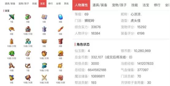 从角色概览信息中可以看到这是一个69级的狮驼岭,玩的时间也不算短了,主要法宝已经基本都培养到了满级。