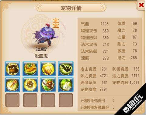 还有一点要提醒广大玩家,最好不要用两只相同造型的宠物合宠,如吸血鬼+吸血鬼,合成极品概率较低,一般的搭配标准是一只技能多的宠物,一只资质成长高的宠物。