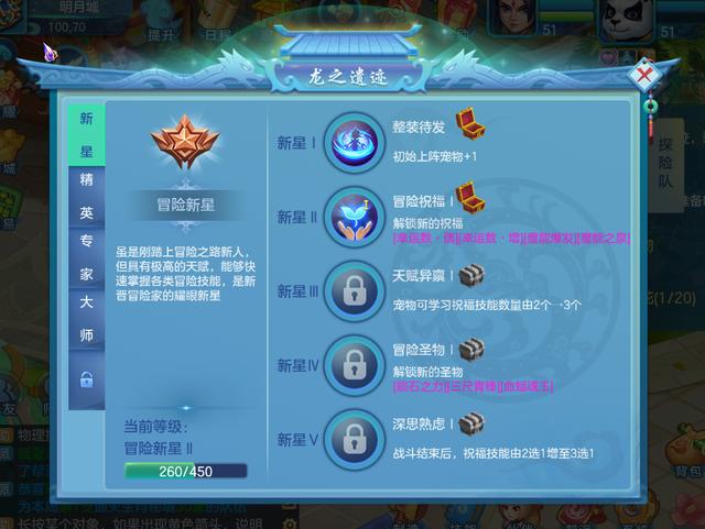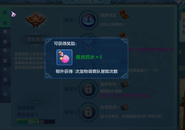 当我们进入该玩法游玩后,还会随着进程解锁一些称号,目前可以解锁的称号分为四个阶段,分别是新星、精英、专家大师,每个阶段当中也有着五个等级的小任务,每完成一个任务后我们就可以领取称谓,同时也可以解锁宝箱,获取一定量的魔灵药水,一些任务还可以解锁新的祝福或是新的圣物。