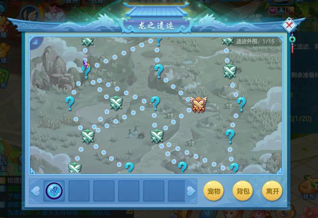 宠物进入"龙之遗迹"后,会出现不同路线选择,路线上还会出现一些图标,其中绿色剑盾图标代表普通战斗,红色剑盾图标代表精英战斗,问号代表随机事件,另外,每条路线上还会有固定的宝箱以及月亮泉。我们每次在完成战斗后,都会随机获得一个技能祝福,可以用来提升宠物的能力。当我们击败精英怪、BOSS,或是触发问号事件后,还可获得各种各样的对战斗有利的圣物。