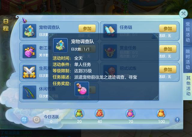 "宠物调查队"是专属于宠物的活动,玩家们要派出三只宠物在"龙之遗迹"中完成通关。那么为了通关"龙之遗迹",我们也需要培养三个强力的宠物,这里哼唧推荐各位最好培养一个单攻物理宠、一个强力群法宠,再加上一个群攻物理或是群攻法宠来补足伤害即可。
