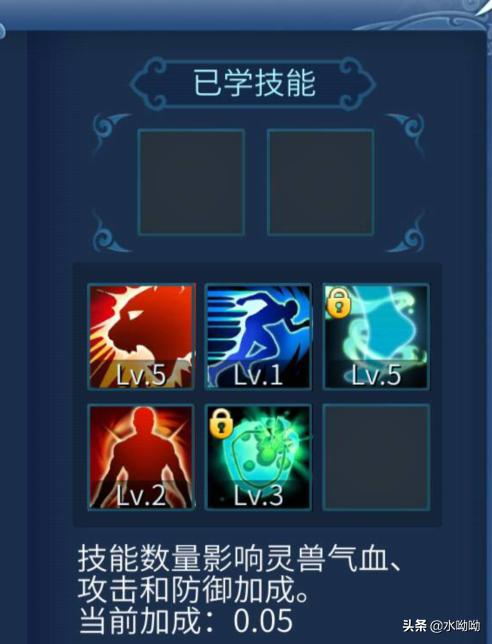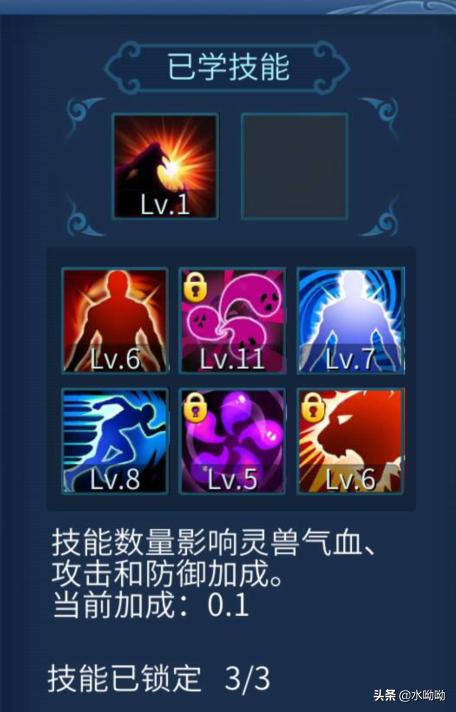 下来关于灵兽技能 其实只要有六个,灵兽的气血,攻击和防御就能加成0.1(10%) 这六个是包括灭威和固原技能的,如果你对冲技能没有兴趣 可以冲开4个格子 然后打上灭威和固元技能也能获得这个加成。