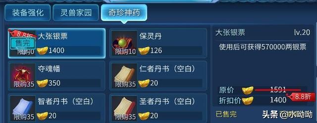 然后月卡党每周都有必须要买的东西,月卡党每周能获得888*7=6216灵玉 ,我一般会买 100个【瓶子】 100个【佛珠】 和两张【大张银票】 使用5600元宝剩下的用来日常使用。 买货运任务的技能或者宝石什么的 几个星期积累后 也可以买买【沧海石心】给灵兽吃。