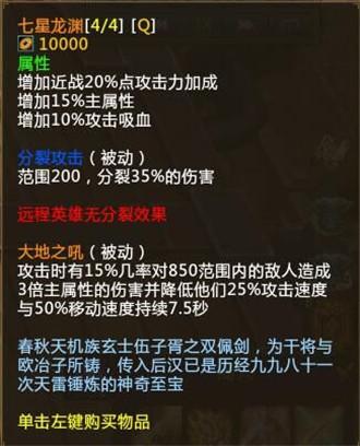 无论是从增加近战攻击力百分之20的属性来看,还是从神器自带的分裂攻击技能上来看,七星龙渊其实是更适合近战输出,自带的百分之10的攻击吸血和概率触发的大地之吼,也给装备该神器者带来了不错的生存能力。适合英雄【张飞,典韦,乐进等】