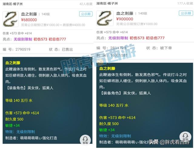 这是前段时间新出的140无级别鞭子,68万被瞬秒。近期,这把武器90万又摆上了藏宝阁,很大可能是商人秒下的。