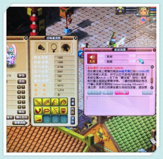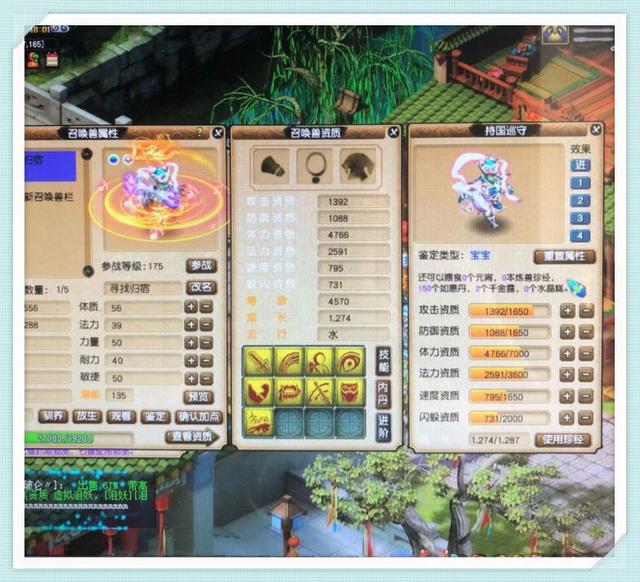 主角就是这个染色的持国巡守,旁边附着角色购买图,成交价2500块,这个角色的名字也是叫9技能持国。技能方面,这只持国巡守有3本辅助技能:高级强力、高级感知和高级幸运。技能来看就是一只全红的连善。值钱当然是值钱的,9个技能的持国巡守还是相当少见的,毕竟是没有必带技能的召唤兽。资质方面倒是又少有点差,攻击资质只有1392,还达不到平均水平,而且速度资质只有795点,还是只龟速宠物。成长方面倒是没有什么问题,1.274成长还是基本在线的。