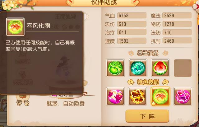 玉面狐狸:春风化雨原自身施法时回复自身10%最大气血⏩己方使用任何技能时自己有概率回复10%最大气血。
