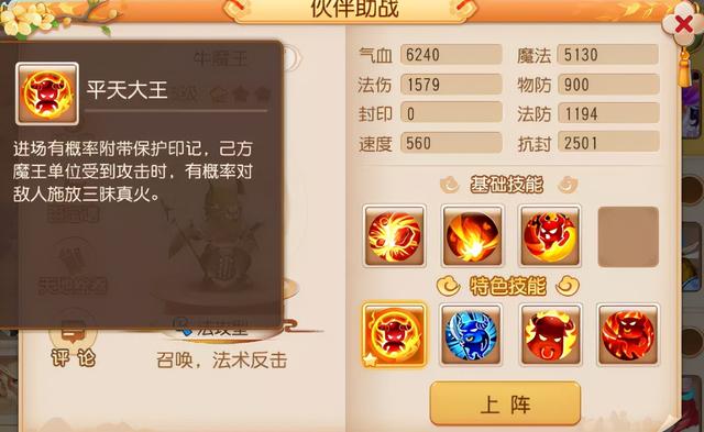 牛魔王:平天大王原己方魔王单位受到攻击时,有概率自己对敌人施加三昧真火⏩保持原有特色的同时进场有概率直接获得保护印记。